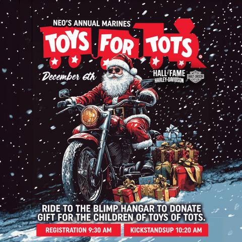 Join us for this year’s Toys for Tots Motorcycle Ride to the Blimp Hangar as we help bring holiday joy to children in our community. Your donated gift—big or small—makes a meaningful difference in a child’s Christmas.
