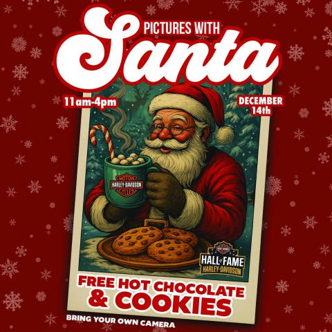 Santa will be at Hall of Fame Harley-Davidson from 11AM to 4PM — don’t forget to bring your own camera to capture the magic.